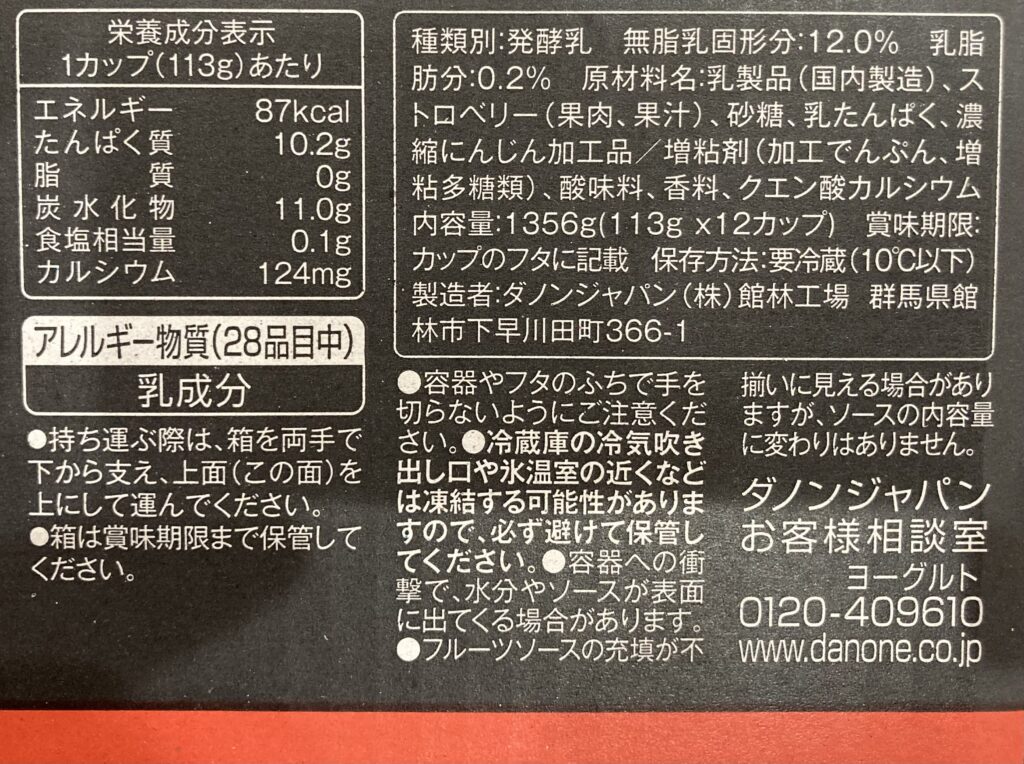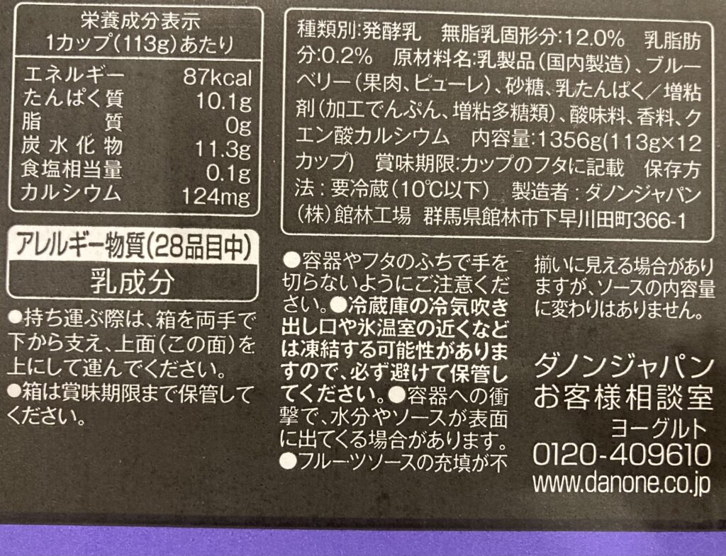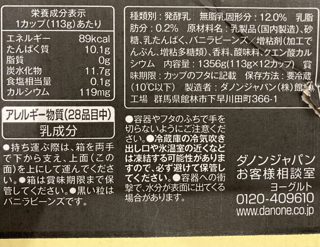 コストコで販売しているオイコスは、箱に栄養成分などの表示があり、1個ずつには記載がありません。